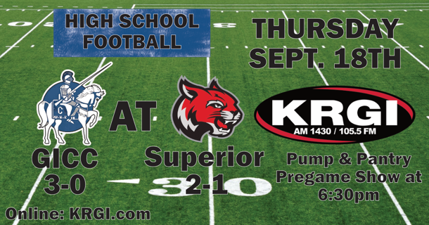 Listen to Thursday night's game on KRGI 1430 AM/105.5 FM & krgi.com. Pump & Pantry Pregame Show will start at 6:30 pm with kick off at 7:00 pm.