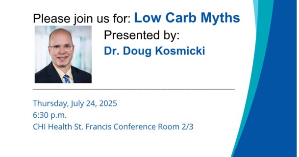 Presented by Dr. Doug Kosmicki, the discussion will debunks myths and misconceptions surrounding a low-carbohydrate diet. Dr. Kosmicki is a board-certified interventional cardiologist practicing at CHI Health Clinic: Nebraska Heart Institute.